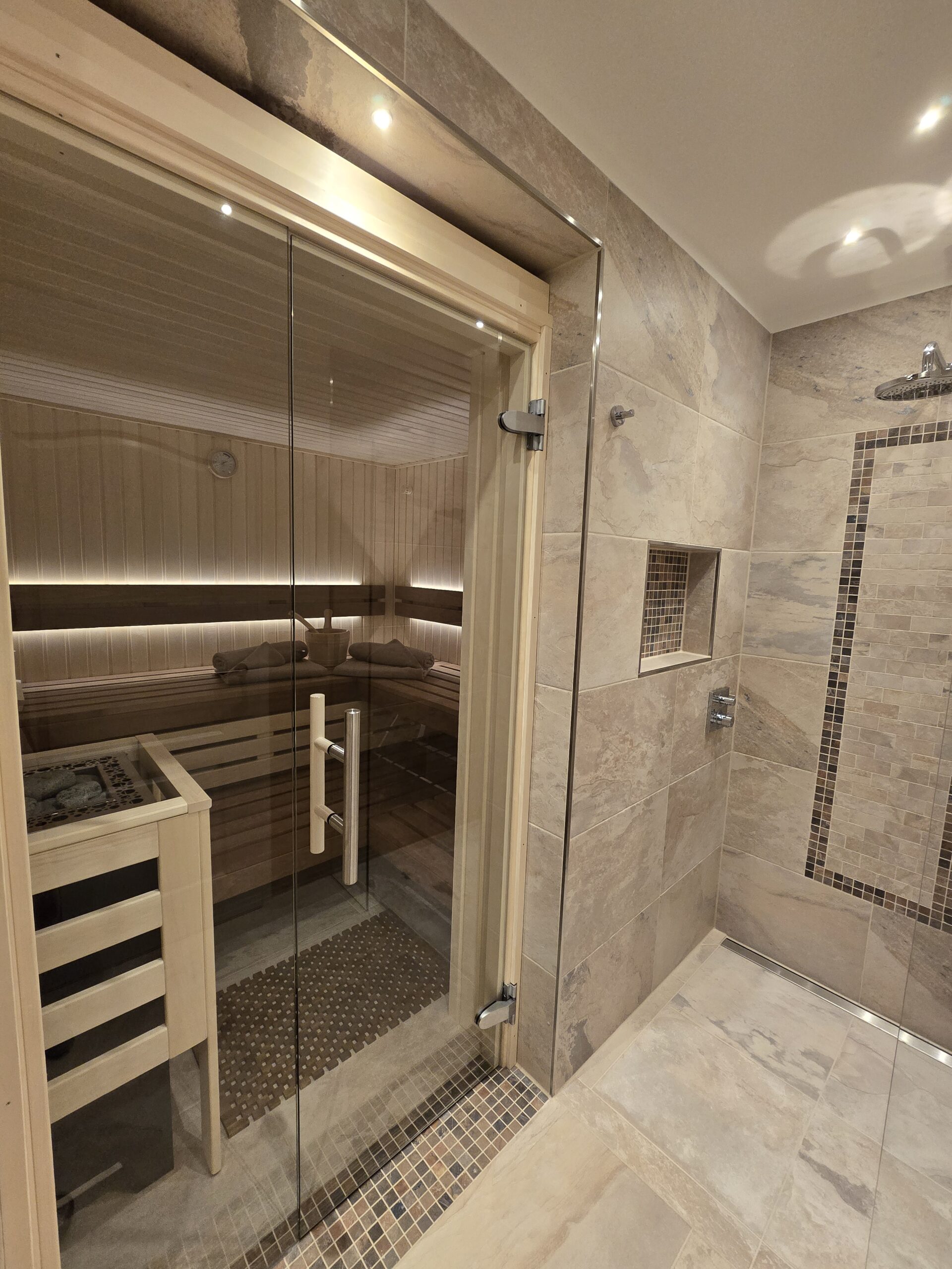 Münzsauna (2 x 2€/h), 4 Saunahandtücher, ebenerdige Dusche