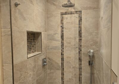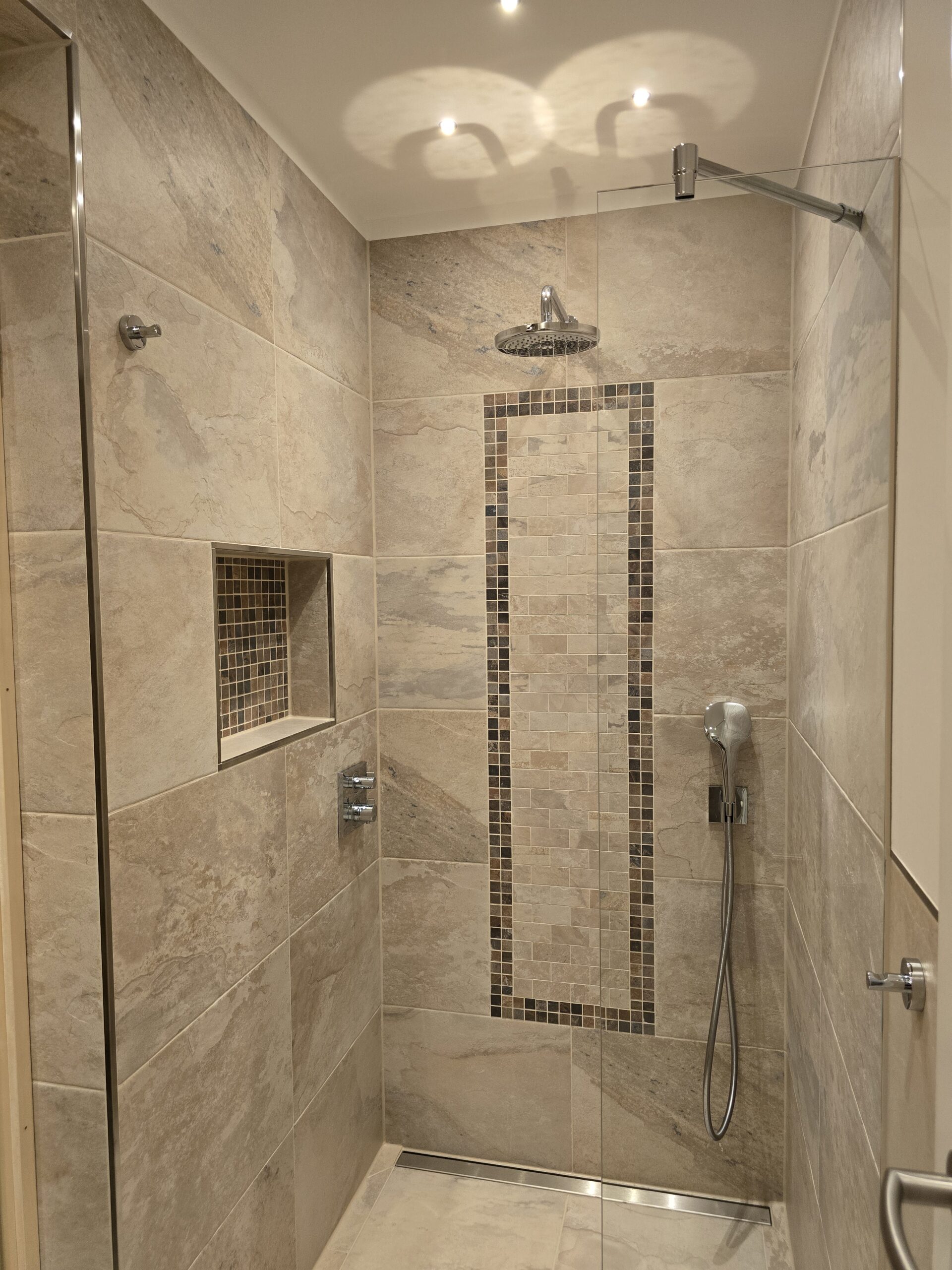 14 qm mit ebenerdiger Dusche (1,50 x 1,50m) und WC, Handtuchwärmer, Föhn, Kosmetikspiegel